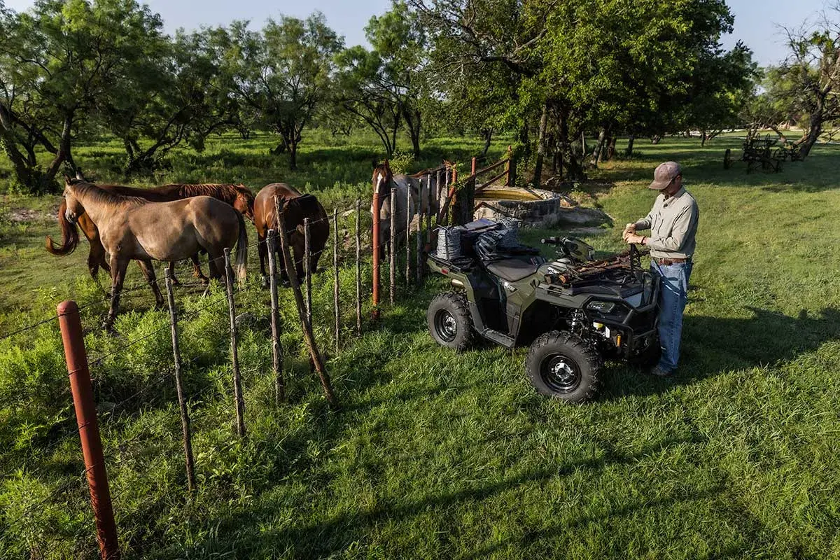 EPS de alta potência, assento de passageiro integrado, Real AWD/2WD sob demanda, reboque de 555,5 kg e bagageiro com 40,8 kg (dianteiro) e 81,6 kg (traseiro).