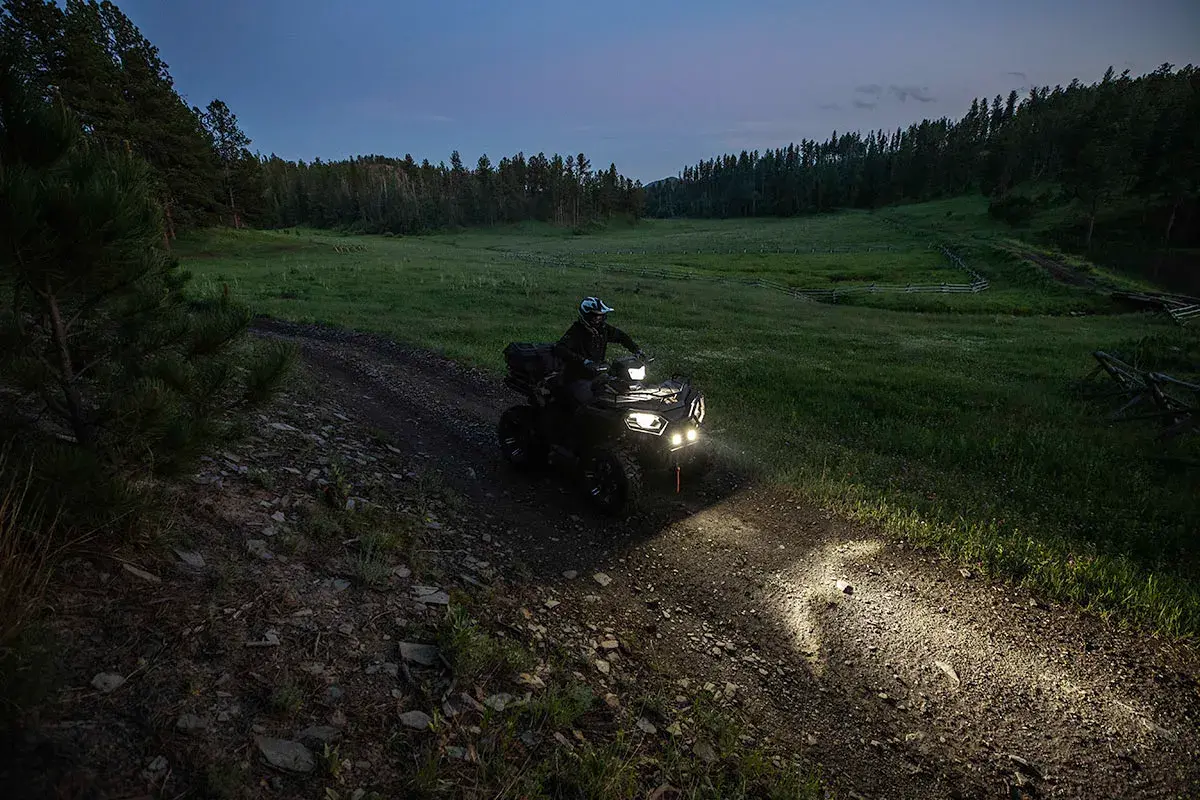 | INSTRUMENTAÇÃO | Painel total digital com velocímetro, odômetro, tacômetro, odômetro parcial 1, odômetro parcial 2, horímetro, indicador de marcha, combustível, AWD, voltímetro, temperatura do motor, luz indicadora de temperatura, extensor de rack frontal, plugue de alimentação de 12 V, pré-cabeado para aquecedores de mão e polegar, carregador de bateria no painel, suporte de guincho incluído. |